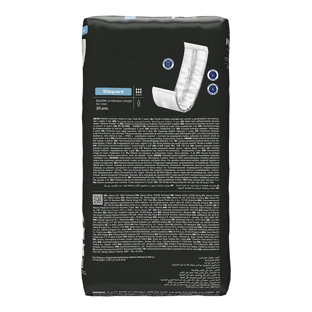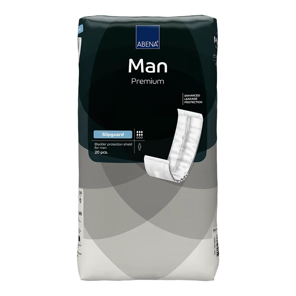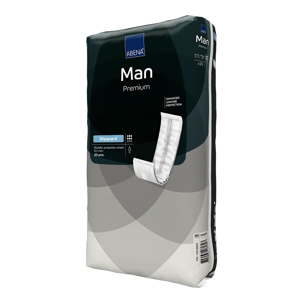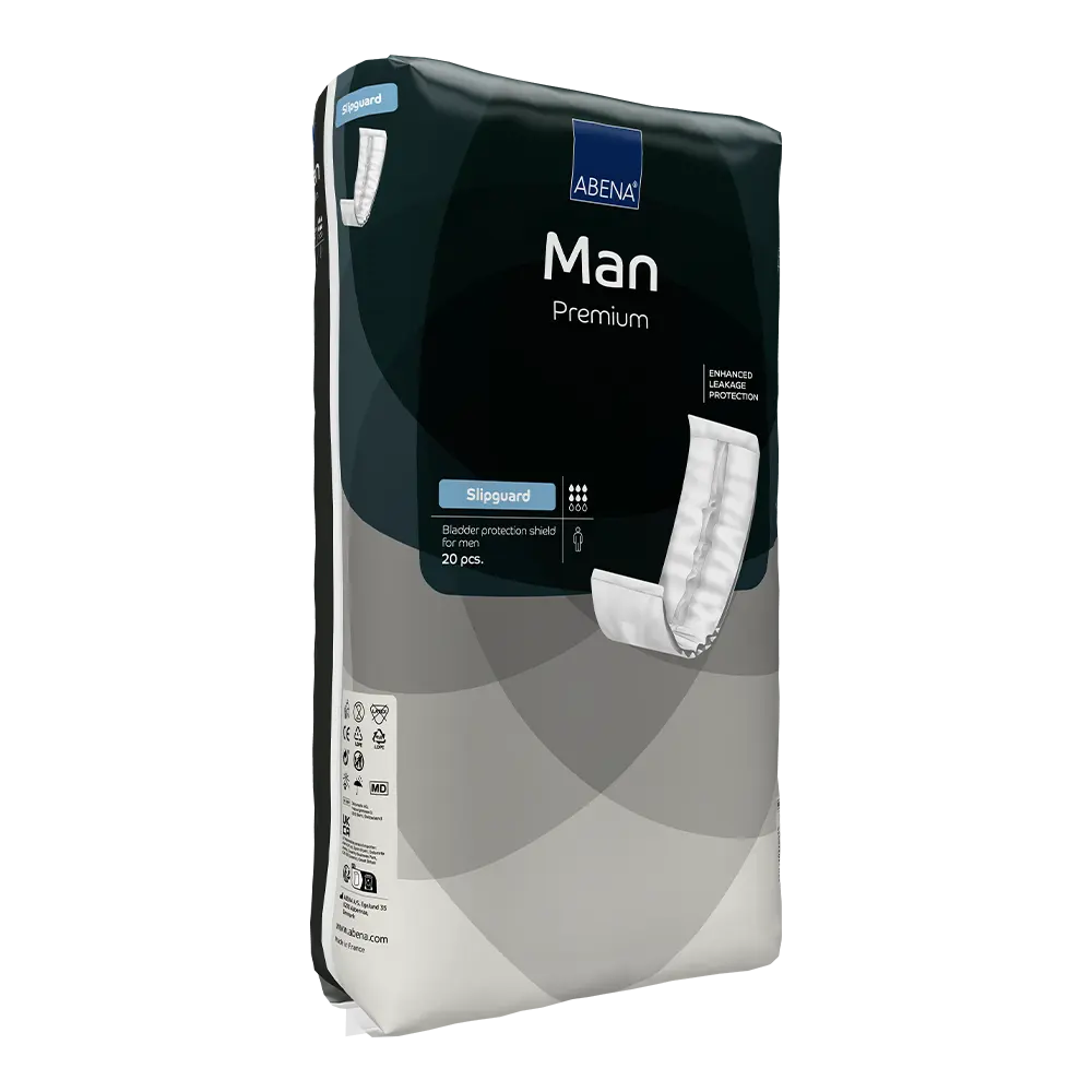 ABENA Man Slipguard is our Premium protection shield specifically designed for male users to provide discreet security for moderate incontinence. The breathable rectangular pad aids skin integrity and offers an excellent fit perfectly adapted to the male anatomy. The products are fitted with leakage barriers for extra protection, and the odour control system minimises unpleasant smells.