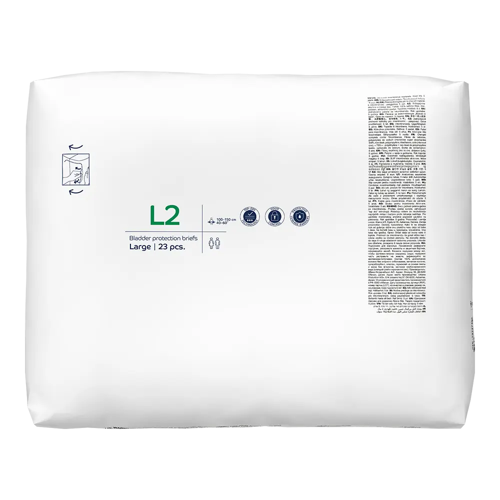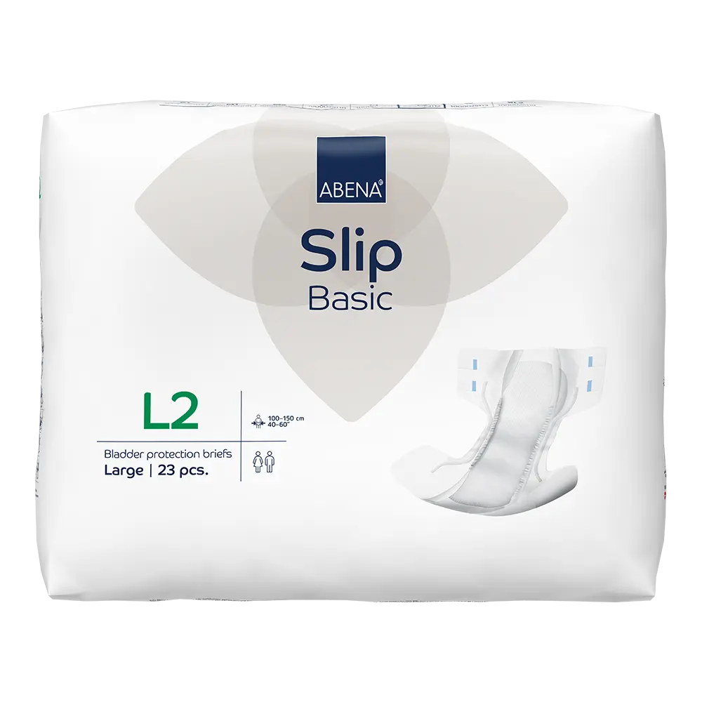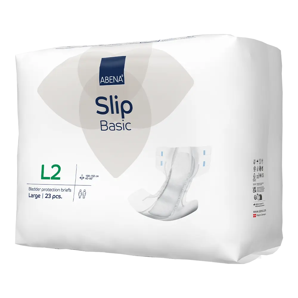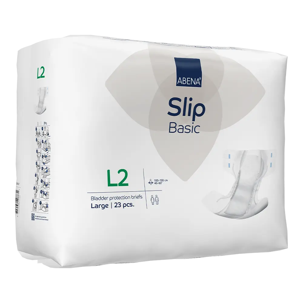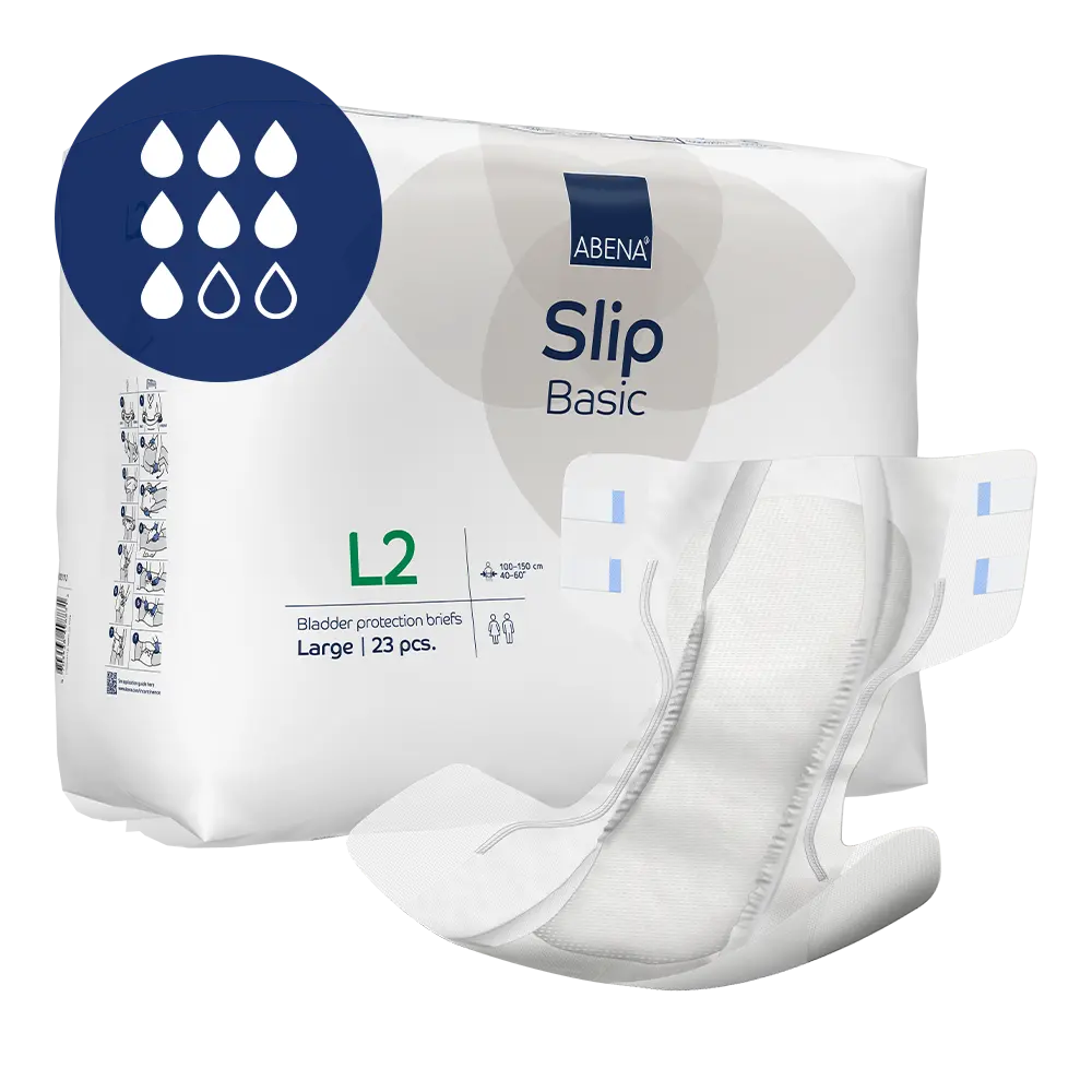 ABENA Slip Basic is our range of bladder protection briefs for moderate to heavy incontinence. The products feature the Top-Dry system for optimum comfort and skin integrity. The anatomically shaped briefs offer an optimal fit combined with curved leg elastics for extra comfort. All products are fitted with leakage barriers and a built-in cross barrier at rear for extra protection. The odor system minimises unpleasant smells. The combi tapes ensure an optimum fit and easy repositioning.