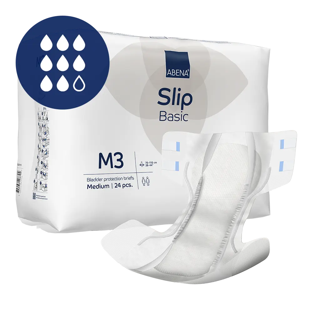 ABENA Slip Basic is our range of bladder protection briefs for moderate to heavy incontinence. The products feature the Top-Dry system for optimum comfort and skin integrity. The anatomically shaped briefs offer an optimal fit combined with curved leg elastics for extra comfort. All products are fitted with leakage barriers and a built-in cross barrier at rear for extra protection. The odor system minimises unpleasant smells. The combi tapes ensure an optimum fit and easy repositioning.